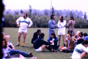 Ik herinner me wel dat we in 1973 met de nog jonge stichting Bobby Kinghe een voetbalteam hadden dat meespeelde in een competitie tussen allerlei Dordtse organisaties die iets deden op cultureel of aanverwant gebied. Het kan ook zijn dat er enkele kroegenteams meededen, want ik herinner me ook een klinkende overwinning op dat van Sprankje Groen, ik meen 5-1. Ik maakte toen een eigen goal, wat me niet in dank werd afgenomen. Wat ik niet meer wist is dat er van zo’n wedstrijd eens een kort filmpje is opgenomen, dat door mijn goede vriend Han van Gorkom op MP4 is gezet. De kwaliteit is niet hoog, het screenshot daarom ook niet, maar de personen zijn nog wel herkenbaar. Het is waarschijnlijk rust, of de wedstrijd is net over, dat weet ik uiteraard niet meer. Ik sta hier als tweede van rechts te praten met een onbekende toeschouwer en Bep Schoor, de verloofde van Han. Curieus jezelf ineens te zien als langharige student van bijna 22, in een voetbaltenue. Dat laatste is misschien het meest curieuze van alles voor een dichtende schaker.