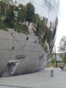 Na afloop zaten we nog even op een bank in het Museumpark en ontdekten we ons spiegelbeeld in De Pot. Op grote hoogte keken we vanaf de begane grond naar onszelf. Een bijzondere ervaring.
