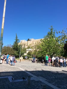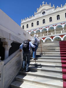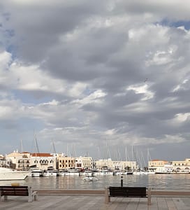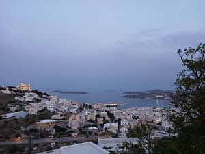 Op de achtergrond staat het hotel waar ik altijd logeer als ik Syros bezoek. Op een landtong met zicht op de haven en de zee. In de verte, op een half uur varen, doemt het eiland Tinos op. De volgende morgen ontbeet ik op het terras aan de zonovergoten haven. De rest van de dagen hebben we geen wolk meer gezien.