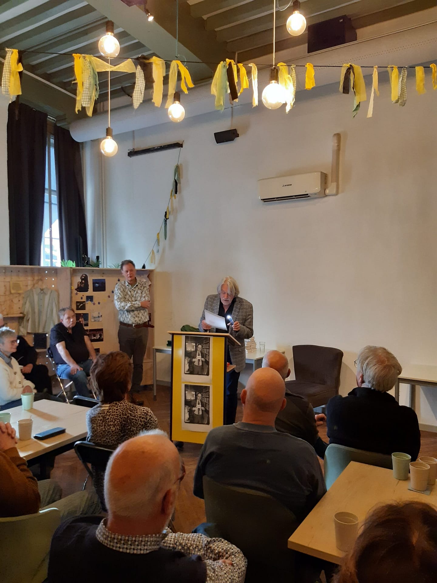 Vriend en kunstbroeder Job Degenaar, die helemaal voor Buddingh’ uit Lemmer was gekomen, las het gedicht dat hij schreef voor de bundel De Blauwbilgorgel 65 jaar! (uitgeverij Liverse 2007). Na afloop dronken we koffie bij Centre Ville, het geboortehuis van mijn grootvader. Job nam daarna deel aan de Buddingh’-wandeling die ’s middags plaatsvond, ik verkaste naar Het Magazijn voor een ontmoeting met vriendin Lé. Ze liet foto’s zien van het werk waarmee ze op het ogenblik bezig is in haar atelier in het naburige Pictura.